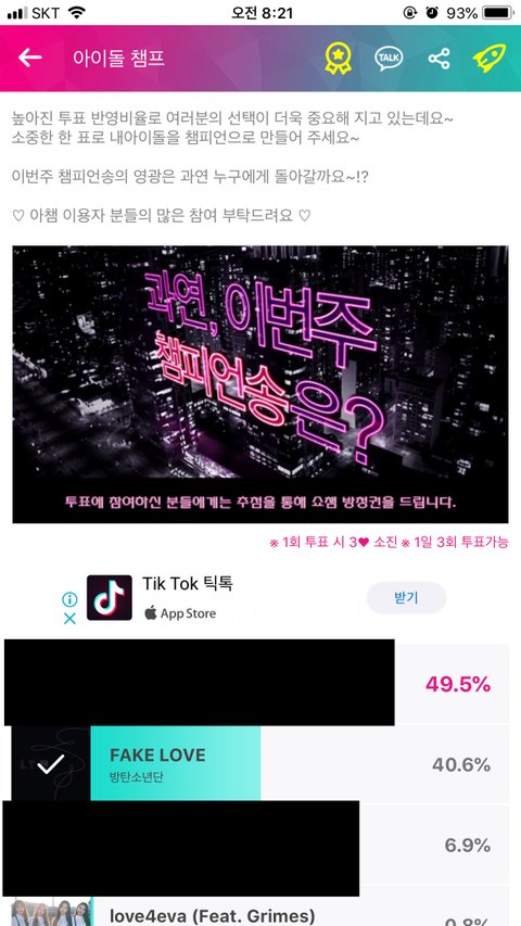 아1지톡 인기가1요 투표도 매일매일 Fake Love투표