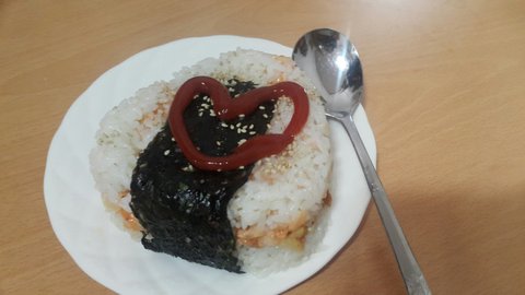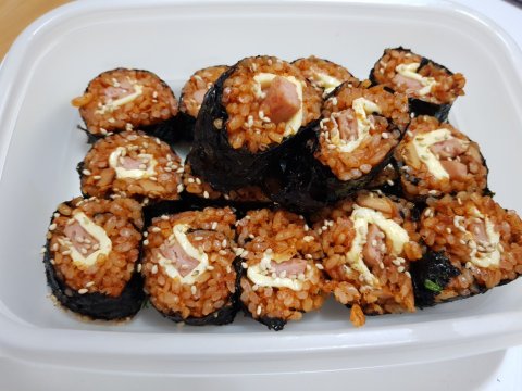 이건 도시락으로 간단하게 만들어서 일회용 용기에 담은건데 후라이팬에 고추장이랑 고추참치 참기름 넣고 볶은다음 김 위에 볶은 밥, 치즈,그리고 구운 스팸 넣고 김밥 처럼 말은거에요 ㅎㅎ 간편하고 맛있어요