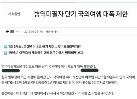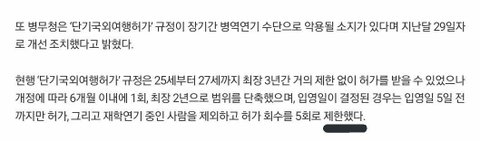 5월 29일부터 병역법이 바뀌었는데 그 병역법이 해외를 1년에 5번 밖에 못 감 그리고 한번 나갈때 6개월에서 2년 이상 머물러야 하고