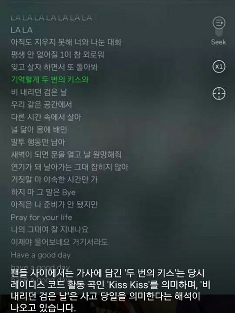 두번의 키스는 은비가 활동당시 Kiss Kiss라는 노래이고 비 내리던 검은 날은 교통사고 날을 뜻 함.