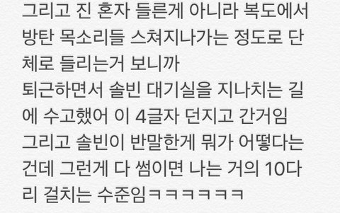 참고로 나 남자임. 내가 보기엔 솔빈이라는 애가 진한테 관심 있는거 같음ㅋㅋ진은 걍 친하니까 마치고 가면서 수고해~ 했는데 급하게 브이앱 마치고 달려나가서 이름 부르는거 보면 (그것도 반말로) 마음이 없다는게 이상한 상황 아님?ㅋㅋㅋ 제대로 팬들한테 인사하고 브이앱 정상적으로 종료하고 나가서 인사한것도 아니고 진 가버릴까봐 급하게 달려나가서 이름 부른거 보면ㅋㅋㅋㅋㅋㅋㅋㅋ 썸이 아니라 짝사랑이라고 해야 맞는거 같은데