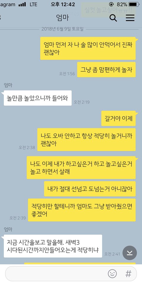 3. 밤 10시에 집에 오라고 연락이 옴.(집에 아무리 늦어도 11시 전에 귀가를 하기를 원하심.)