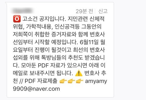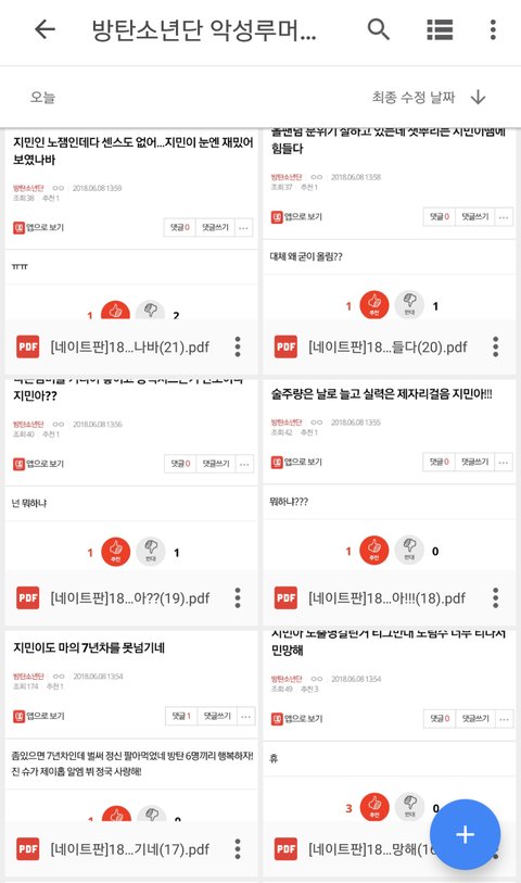 안녕하세요 방탄소년단 고소 고발 자료 모음 관련 관리자입니다.듣던 중 반가운 소식이네요, 어제자부터 네이트판 방탄소년단 팬톡에서 총 77건의 방탄소년단 지민군의 명예훼손 및 모욕 관련글이 접수되었고,현재 해당 게시물을 모두 찾아 링크 정리 및 캡쳐 pdf변환 작업중에 있습니다. 모든 자료들을 정리하고 난 후 해당 고소 건 메일에 첨부하여 링크까지 자세히 보내드리도록 하겠습니다. 감사합니다:)
