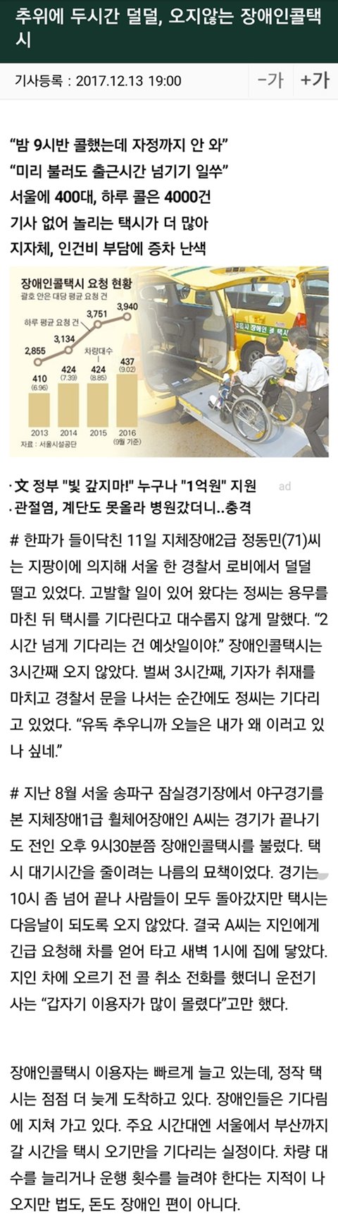 이렇다 보니 장애인 콜택시로는 시간 약속을 제대로 지킬 수 없고, 특히 저녁에는 사람을 만나도 귀가할 때까지 3시간이고 4시간이고 차를 기다려야 하는데, 밤늦은 시간에는 식당이나 카페가 대부분 문을 닫기 때문에 길바닥에서 대기하고 있어야 할 때가 많습니다.