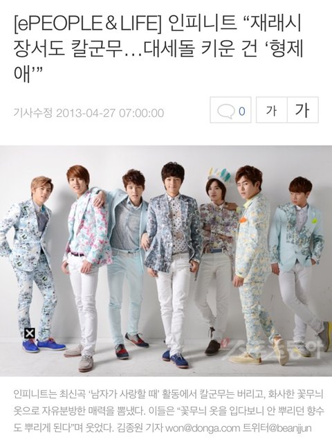 남성 7인조 인피니트. 설명이 필요 없는, 엄청난 팬덤을 가진 ‘대세’다. 최근작 ‘맨 인 러브’로 모든 음악방송에서 1위를 차지했고, CD는 21일까지 모두 10만2215장(한터차트 집계)이 판매됐다. 벼락스타로 보이지만 이들도 눈물 젖은 빵을 먹었다. 포기의 유혹을 받을 때마다 서로 격려하며 “성실과 신념”으로 이겨낸 이들의 수다는 그래서 정겨웠다.