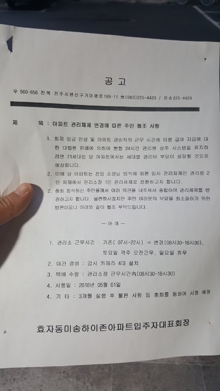 어느 날 갑자기 아파트 엘레베이터에 한 장의 공고가 올라오게 됩니다. 사진을 찍어놓지 못해 증거가 없지만 내용인 즉슨 시급인상으로 인해 기존 경비원을 해고하고 관리소장겸 경비원 1인 체제로 진행할 것이며 그에 관해 입주민 회의를 하겠다는 내용이었습니다 해당 내용에 엘레베이터에 종이 한장짜리 공고만 부착했을 뿐 아파트 방송조차 하지 않았으며 입주민 회의 당일 방송은 딱 한번 되었습니다 웃긴건 입주민 회의 직전 아파트 대표란 사람이 기존의 경비원 두분께 사직서를 제출 할것을 권했으며 이미 사직서를 받아놓고 새로운 관리소장겸 경비원을 채용한 상태에서 형식적인 입주민 회의를 진행한 것입니다 회의에서 많은 입주민이 참석을 하지 못한 상태였지만 일부 입주민이 반대를 했음에도 불구하고 당 아파트 대표는 새로운 경비원 채용으로 최저시급을 운운하며 밀어붙였고 3개월간의 유예기간을 두고 문제점 발생시 다시 입주민 회의를 통해 조정하겠다며 회의를 마무리 지었습니다. 결국 1년 가까이 성실히 근무해오시던 경비원 두 분은 떠나시게 되었고 새로운 관리소장겸 경비원 한분이 오셨으나 근무조건은 상위 근무시간을 준수하되 모든 공휴일은 휴무... 평상시 근무시간에는 작업중이란 종이 쪼가리 한장 붙여놓고 어디서 뭘 하시는지 당최 나타나질 않으며 아파트 주변 지하주차장 옥상 및 그 어딜 둘러봐도 경비원 흔적조차 찾을 수 없다는 주민들의 말이 나오고 있는 실정입니다. 위 사진처럼 평일에도 분리수거함 관리가 제대로 이루어지지 않으며 주말이 낀 휴무일에는 많은 쓰레기양이 관리가 되지 않아 악취가 진동합니다. 단지내 위치한 작은 놀이터에는 미성년자들이 먹은 술병과 쓰레기들이 널부러져 있고 입주민 주차외에 단속하던 경비원이 없어지자 마자 너도 나도 입주민 외 주차를 하는통에 주차장엔 주차할 공간조차 없습니다. 기존에 경비원 두분이서 교대로 근무하실 땐 야간에도 주차단속 수시로 하셨고 경비실에서 주무시되 취객이나 미성년자들 고성방가에 즉각 대응하시며 경비원 업무에 충실하시며 하루 꼬박 근무하시고 백만원 급여 받으시는 두분을 사직서를 낼 것을 강요하고 최저시급 운운하며 새로운 경비원에게 220을 주는게 참 이해가 안됩니다. 기본 관리비가 13만원이 넘는 이 아파트에서 71세대의 관리비가 어떻게 운영되는지 감사 조차 없다고 하니 많은 의구심이 듭니다. 제가 잘 몰라서 그러는데 아파트 관리비와 운영에 따른 사항을 어디에 문의해야 명확한 답이 나올까요 답답함에 긴 글을 작성하게 되었습니다 비슷한 경험 있으신 분 답변 부탁드립니다