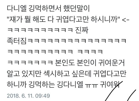 강다니엘 본인도 자기가 귀여운걸 알고는 있지만 뭘해도 귀엽다고하니까 깅먹금ㅋㅋㅋㅋㅋㅋㅋ 이유까지 귀여워 씹덕이야 징짜ㅋㅋㅋㅋㅋㅋ