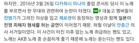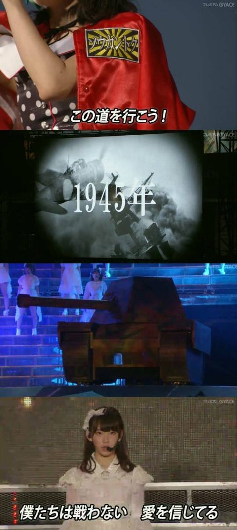 가해자들이 우리들은 싸우지 않아~ 라고 하며 센터는 의상에 욱일기 달고 춤 추고 노래 부름.