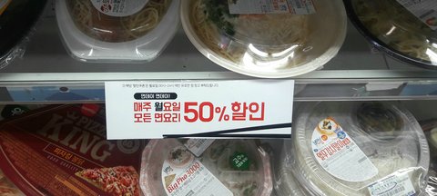 얘들아 방금전에 엄마랑 편의점에 과자 사러 갔다가 알게 된게 있는데 지금 지에스편의점에서 면 즉석식품 반값 할인중이야 월요일만!!