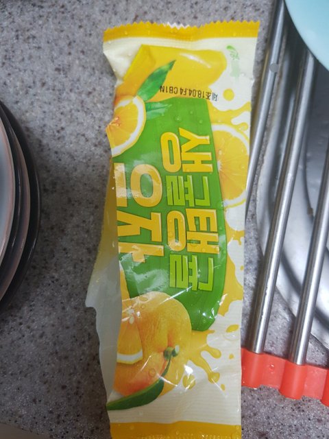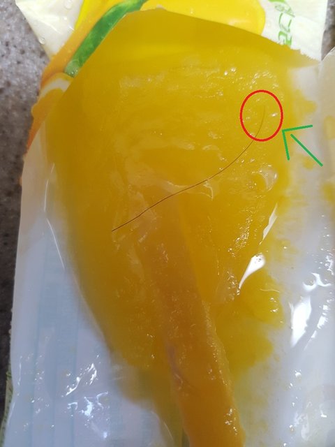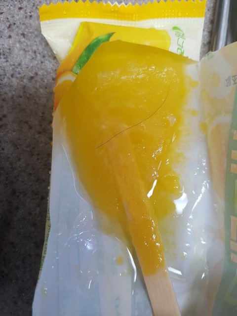 냉동실에 있다가 저번주 빙00 생귤탱귤 유자 아이스크림을 먹다가 이런 머리카락이 박혀 있어서 너무 기분이 상했다.