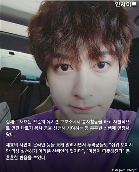 재효같은 아이돌 진심 드물다 다들 알아줬으면 좋겠음 봉사도 많이 다니는데 일단 성격부터가 ㅈㄴ 개 보살임 진짜 멤버들이 장난 좀 심하게치고 몰이도 심하다싶을정도로 하던데 걍 다받아주더라 짜증한번 안내고 웃으면서 7년넘게 받아줄수있는거 절대 쉬운일 아님 그리고 무릎도 진짜 많이 안좋은데 춤 열심히추고 늘 노력함 더군다나 춤 격하게 추면 무리많이 가니까 매번 잘 안보이는 대형 뒤쪽에 있는데 절대로 대충 안함 얼굴도 잘생기고 운동도잘하고 낚시랑 게임도 잘하고 본업도 잘챙기면서 성격까지 착한사람이 몇이나될까