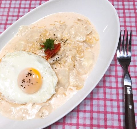 우유랑 체다치즈 넣고 라면사리랑 떡국떡 넣고 후라이 올리기 !