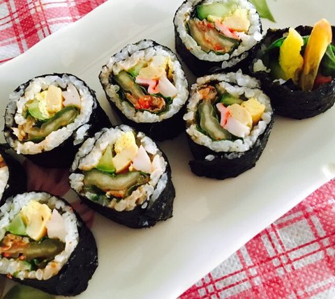 집에 있는 맛살 오이 계란 깻잎 김치넣고 꼬마김밥!