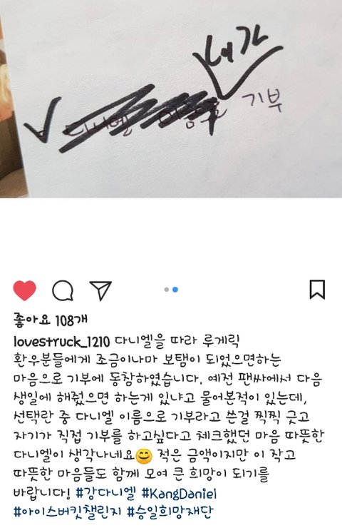 홈마가 팬싸가서 생일때 햇으면 좋겟는거 골라달라고 햇엇는데 선택란에 다니엘 이름으로 기부잇엇는데 다니엘이 찍찍긋고 내가 기부 이렇게 써줫대