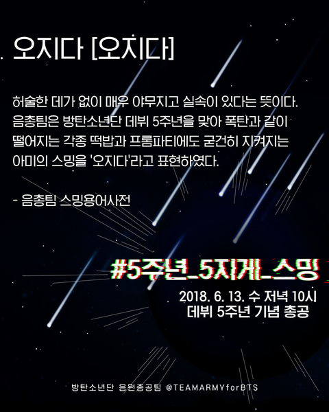 2) 오늘 저녁 10시에 데뷔 5주년 기념 음원총공을 진행합니다.#5주년_5지게_스밍 해시태그와 함께 스밍인증샷을 올리시며 서로 음원 스트리밍을 독려하고 칭찬해보는 시간을 가져봐요.음총팀 트위터로 올라오는 지니 음악 나누기에도 참여하세요.