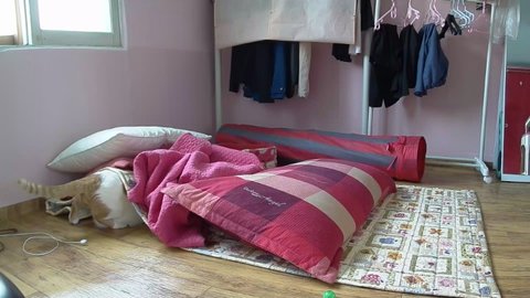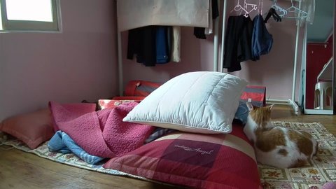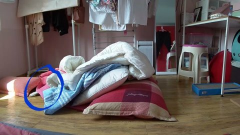 도착할 시간이 되자 도칠이 어슬렁어슬렁 이불속에서 나옴.