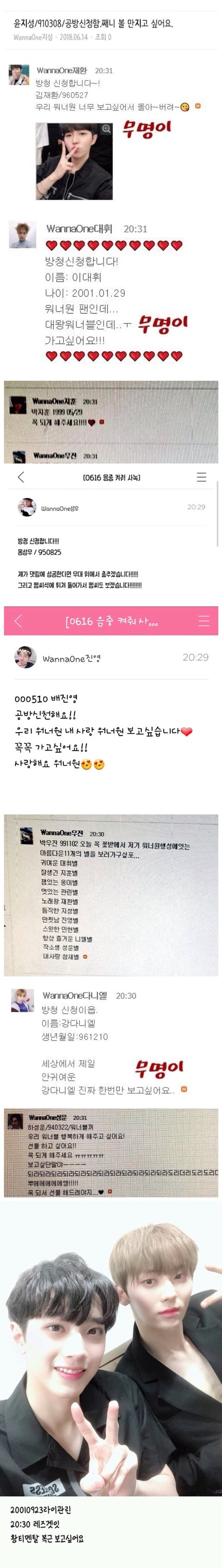 단체로 댓림 한거 존웃 ㅋㅌㅋㅋㅋㅋㅋ 숙소에서 자기들끼리 우리 공방 신청 함 해보까?? 하면서 했을 수도 잇잔아 ㅅㅂ ㅜㅜ 그와중에 황민현은 광탈 당해서 못 달앗대... 그리고 다 중복에다가 양식 틀려서 워너블들 단호하게 틀렸다고 못 간다고 얘기해주는거 보다가 웃음이 끊이질 않는다 진짜 존귀 jnj