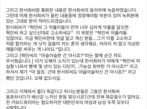 아래는 강혁민 고소글과 한서희가 합의해달라고 사과문쓰고 전화한거 캡쳐임