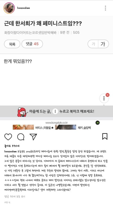 또 한서희는 페미로 물건을팔려다가 욕먹으니 페미이제 안한다. 선언한적도있음