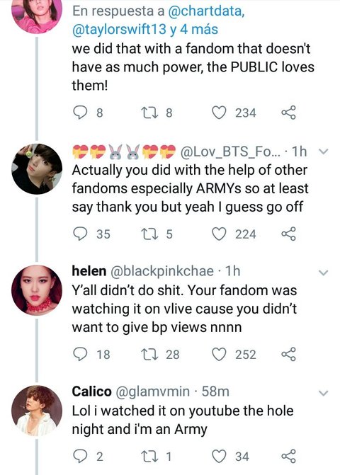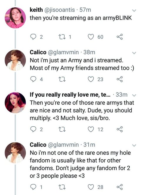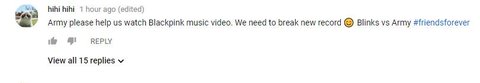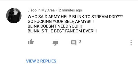 코어팬 무시 안할테니, 해외 블핑팬들도 어느정도 분별은 했으면 좋겠다. 타가수 유튭 뮤비영상에 이딴식으로 댓글 다는건 무례하잖아. 트윗으로 방탄팬들을 도발하는 글은 왜 날리는 거야? 그냥 자기가 응원하는 가수의 성과에 기뻐하는 걸로는 성이 안차냐? 그럴거면 도와달라는 얘기는 왜 해.