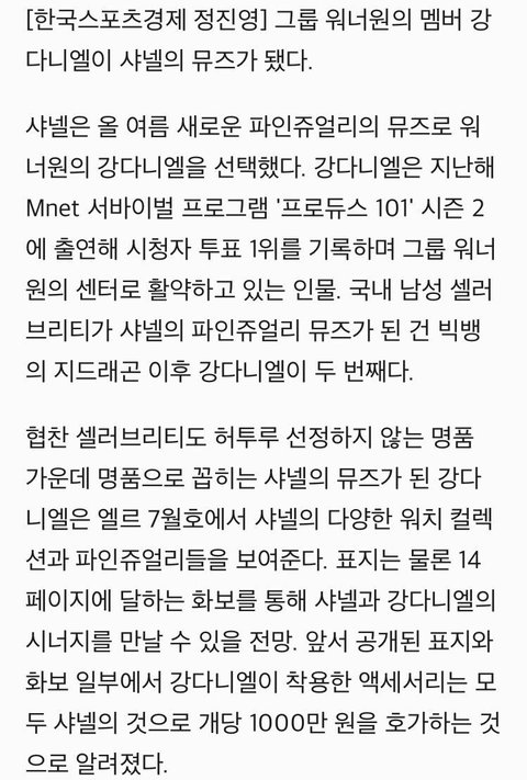 강다니엘은 유가화보라고해서 샤넬이 직접 모델을 정하고 모델비를 직접 줌으로써 다니엘을 쥬얼리 모델로 픽한거임!