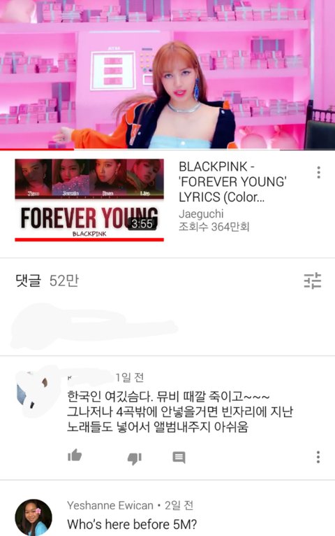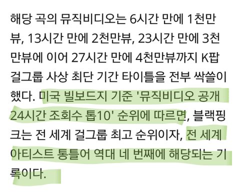 * 댓글로 '첫날'이라서 2,400만뷰고 24시간은 3,300만이 맞다고 시비거는 머리나쁜 애들은 다 블핑팬들이니? 첫날 조회수는 18시~24시까지 950만 나왔단다.