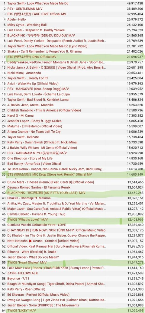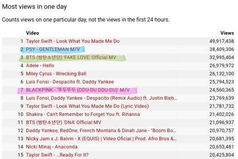 현재 역대 2,3위인 싸이, 방탄은 뮤비발표 3~4일후에 공식화되는 유튜브공식기록으로 현재 2,3위 땅땅