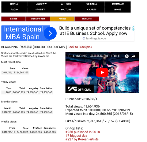 * 블핑팬분들이 자료에 대한 신뢰도를 너무 무시해서 추가함. 오류나 기준이 다른 경우가 종종 있지만 미국내, 전세계 아이튠즈, 유튭, 스포티파이, 세일즈, 아티스트순위까지 내놓는, 11년 된 사이트임