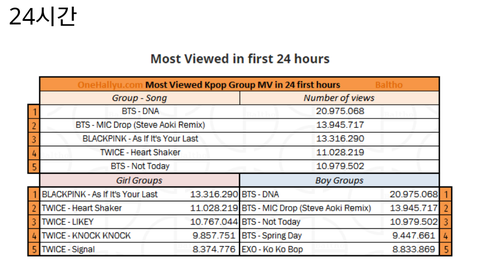 기존 방탄, 블핑, 트와이스의 24시간 기록은 저 자료와 기록표가 거의 똑같음. 아니 도리어 더 높게 나옴. 19시간분은 멍멍소리.