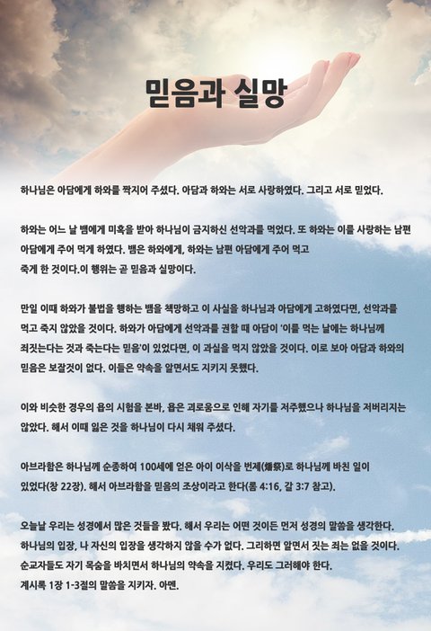 안녕하세요.오늘 이웃님들과 함께 나눌 말씀은 ''[창세기 2장] 주만 바라볼지라, 믿음으로 서리라 입니다.''함께 말씀 상고하시고 믿음으로 서리라 라는 고백을 하는 성도님 되시기를 소망하겠습니다.