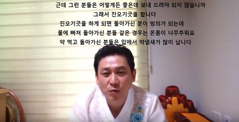 진오기굿을 합니다 진오기굿을 하게 되면 돌아가신 분이 빙의가 되는데 물에 빠져 돌아가신 분들 같은 경우는 온몸이 너무추워요 약 먹고 돌아가신 분들은 입에서 약냄새가 많이 납니다