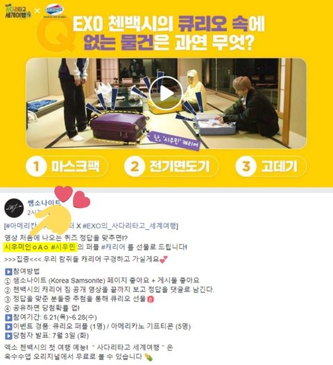 샘소나이트 페북계정에 시우미인 캐리어 이벤트 ㅋㅋ(시우민)