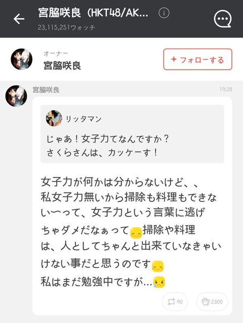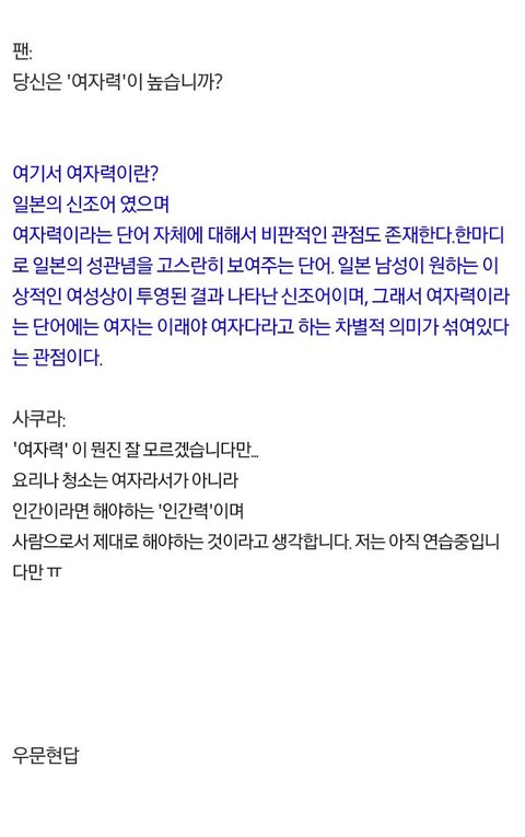 팬이 "여자력"이라는 단어를 쓰면서 성차별적인 질문을 하자 그건 "여자력"이 아니라 "인간력" 이라고 얘기함 ㄷㄷ