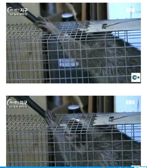 라쿤들이 철창에 갇힌채 동료라쿤이 고통스럽게 눈물흘려가며 가죽이 벗겨지는 모습을 바라보며,
