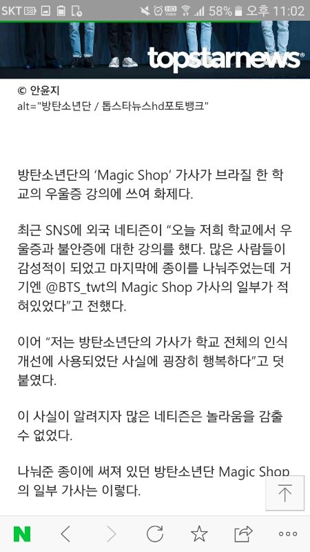 최근 SNS에 외국 네티즌이 “오늘 저희 학교에서 우울증과 불안증에 대한 강의를 했다. 많은 사람들이 감성적이 되었고 마지막에 종이를 나눠주었는데 거기엔 @BTS_twt의 Magic Shop 가사의 일부가 적혀있었다”고 전했다.