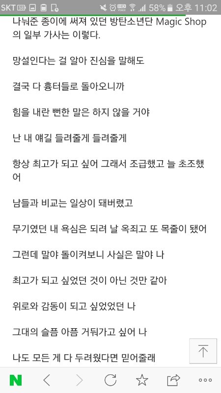 난 아민데 나도 항상 방탄가사보면서 위로를얻고 그랬거든..이노래말고도 들으면 진짜 위로되는게 엄청많아ㅠ