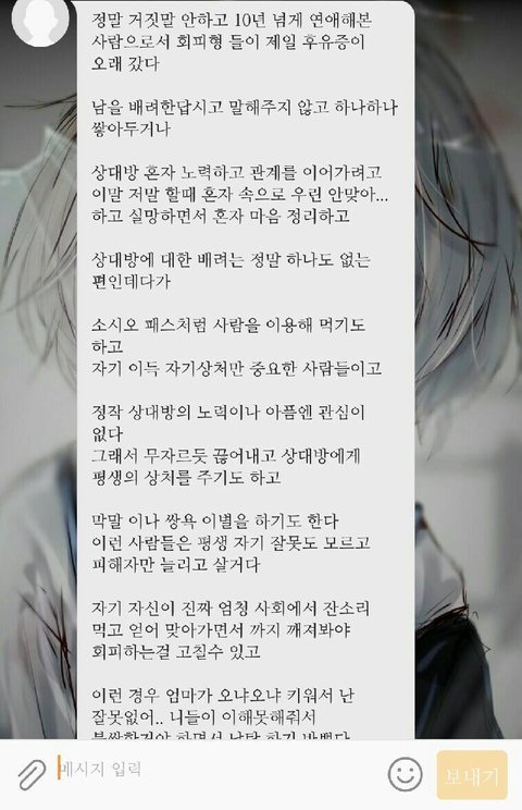 헤어질때조차 일방적임;; 여러사람을 만나고 헤아지고 해봤지만 회피형 진짜헤어질때 일방적..