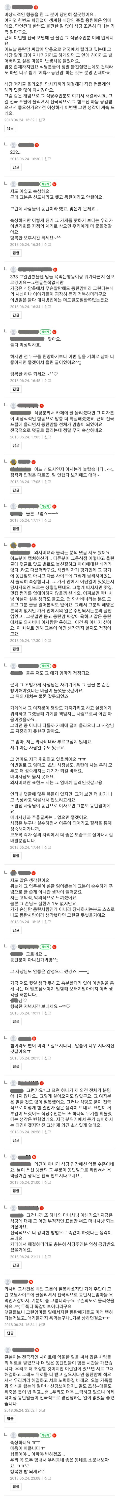 사장님이 글 올렸을 때 동탄 언급은 없었는데 그 때 베플이 동탄 아니냐고 했죠. 실제 다들 알아보니 동탄이 맞았고요. 동탄에서 이런 일 일어난 거 한 두번이 아니니 베플에 동탄이 언급된 거 아닌가요? 기분이 나쁘다, 아이 배려를 안해 준다....단순 서비스를 받지 못해 기분 나쁜 것과 생계를 이어가야만 하는 문제가 같은 무게인지 생각해 보셨으면 좋겠어요. 만약 내 부모가 형제가 동탄에서 장사를 하고 있어도 똑같이 행동하실까요? 동탄맘 카페에 올려드릴게요. 하면서 서비스 요청하고 조금만 기분이 나쁘면 카페에 올릴거에요! 하면서 협박하고. 아무리 세상 살이 팍팍해져도 서로 조금씩의 양보와 배려는 필수인거에요. 내 기분을 상하게 했으니, 혹은 내 아이를 배려 안했으니 이런 가게는 망해도 싸! 이런 발상은 어디서 나오는 건지 궁금합니다. 또 동탄맘이라고 싸잡아 욕하는 거 기분 나쁘다고 하셨는데 동탄맘 카페에서 많은 분들이 와사비녀 분이 잘못된 거라고 지적하신다 하셨죠? 그런데 지금 이 원글에 캡춰된 것처럼 식당주인도 나쁘다고 하시는 분이 계시니 튀는 겁니다. 카페 안에서 직접 해결했어야 했다고요? 누가 학교폭력을 당사자끼리 해결합니까. 힘의 차이가 나는데 맞싸움이 되겠어요? 정정당당이 되겠어요? 오죽하면 포털에 올려 억울함이나 풀어보고자 했을까요? 그 사장님이 소금 뿌린다고 하신 말 뒤에 내가 왜 그랬을까..왜 그랬을까. 그 자책섞인 말은 못 읽으시나요? 아무리 장사하는 사람 간 쓸개 빼놓고 해야 한다지만 남의 자존심, 생계마저 무너뜨리는 파렴치한 짓 좀 하지 마세요. 그 날 그렇게 고성 지르면서 갑질 하신 분. 어디선가 님 아이도 그런 일 당할 수 있어요. 커서 알바 한 번 안시키실 거에요? 그 사장님 내외도 누군가의 귀한 자식이에요. 그 부모님이 오셔서 어디서 내 아이한테 소리지르냐고 하면 어쩌시려고 그러세요?? 어느 떡볶이집에서 고추장을 빼느냐고 물어 본답니까. 어느 감자탕집에서 매운 소스를 빼느냐고 물어봐요? 그리고 싸잡아서 욕먹는거 싫으면 자정 똑바로 하세요. 식당 주인도 잘못했네, 전국구로 우리가 욕먹어 억울하네 하시지 마시구요. 오죽하면 사람들 인식이 또 동탄맘이야? 하겠어요. 쯧쯧