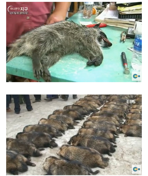 라쿤들이 철창에 갇힌채 동료라쿤이 고통스럽게 눈물흘려가며 가죽이 벗겨지는 모습을 바라보며,