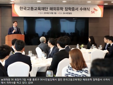 5일 SK그룹에 따르면 최태원 회장은 이날 서울 종로구 SK서린빌딩에서 한국고등교육재단 선발 유학생 30명에게 장학증서를 수여하고 오찬을 함께 했다. 최태원 회장은 이 재단의 이사장이다.