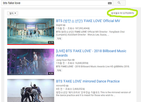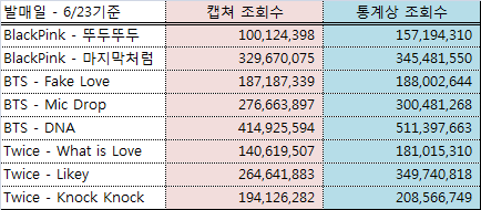첫번째 표의 블핑 뮤비통계수치는 일리가 있는게 맞고, 오히려 B그룹 Fake love의 통계수치가 큰 오류가 있는걸로 확인 함