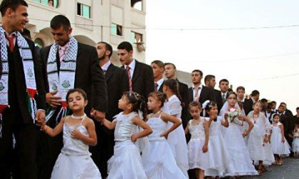 이스라엘 내 무슬림 거주지역인 ' 가자지구 ' 에서 거행된 450쌍 합동 결혼식을 촬영한 사진이다.