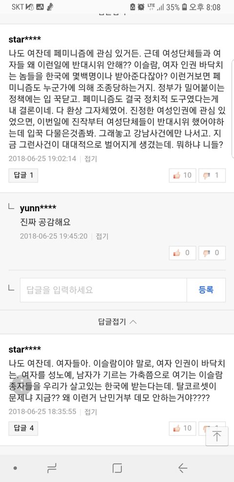 조혼등으로 어린나이에 죽어가는 여자들이 그렇게나 많은 나라의 남자들이 입국한다는데 왜 반대를 안하는걸까? 그것은 바로 국내정치와 연관되어 있기때문이다 문재인이 난민을 받아들이기로 했으니 국내페미들이 반대를 안하는것이다 페미니즘? 여성인권? 그런건 애초에 관심도 없었던 것이다 페미니즘은 환상에 불과하고 쇼에 불과했던 것이다