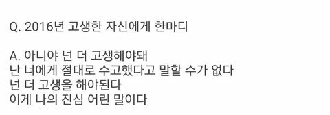 제가 전에 정국님?이 자신한테하는말중에2016년도에는 자기한테 고생한거아니라고 더해야한다고 했는데 2017년도에 고생많았다...한게 2017년도 맞죠?그게 너무 보다가 타팬인데 멋있고 슬퍼서 저장했던기억이있는데 2017년이 맞는지 궁금해서용.