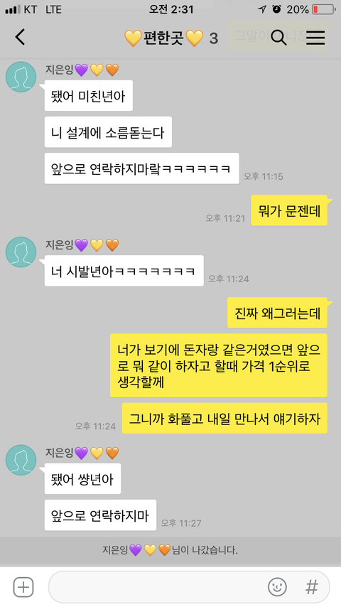 집와서 다시 카톡하는데 알 수 없는 말만 늘어놓고 단톡을 나갔습니다.