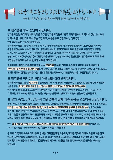대한민국 헌법에 명시되어 있는 종교의 자유를 해치는 파렴치한 위범을 자행하고 있는 한기총! 이 땅의 헌법을 어기는 것은 물론이요, 하늘의 천법까지 어기는 행위를하늘도 땅도 두렵지 않은지 서슴없이 행하는 한기총이 대한민국 기독교를 대표하는집단이라는 것이 얼마나 대한민국을 부끄럽게 만들고 있는지요.