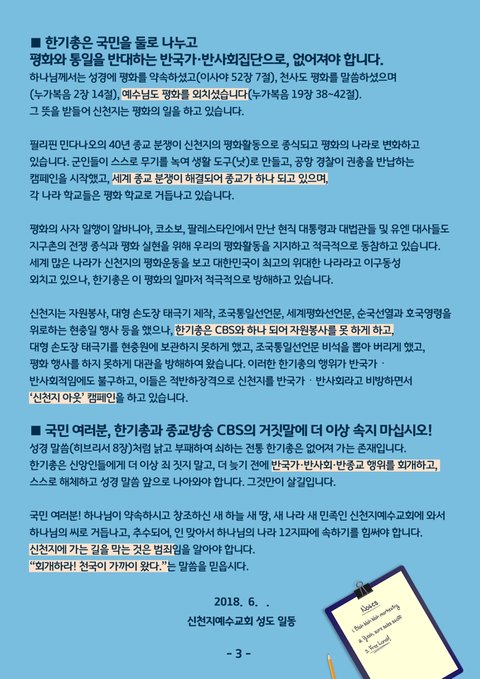 한데 한기총과 CBS는 도리어 신천지에 전쟁을 선포하고 자원봉사도 못 하도록방해하고 손도장 대형 태극기를 버리게 했습니다.