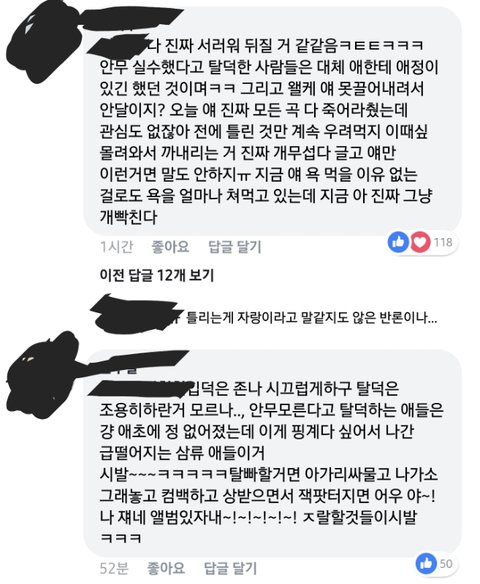 안무 실수했다고 탈덕하는건 걍 정이 없었는 거다 - 니가 뭔데 내 애정 판단하냐 내가 탈덕한 건 잦은 안무 실수와 갑분싸 팬썹으로 인해 내새끼 욕먹는 일상이 현타와서 탈덕한 거다 본인 잘못으로 욕먹는걸 쉴드칠 수도 없고ㅅㅂ.. / 입덕은 시끄럽게 탈덕은 조용하게 - 이것도 내맘이지ㅅㅂ 도대체 이 개떡같은 룰은 누가 정했는데ㅋㅋ 새끼한테 좋은 감정이 남아있으면 몰라.. 다른 사람 잘못도 아니고 걍 지가 지 본업 ㅈㄴ못해서 욕먹는데, 씨2발 그런 사람도 나름 정붙인 사람이라고 안 좋은말 듣는 게 너무 가슴아프고 미안하고.. 난 이렇게 심란하고 우울한데 왜 얘는 고칠 생각을 안 하지???? 본인에게도 이득이고 본인 그렇게나 좋아하는 팬들에게도 너무 행복한 방법인데 왜 노력을 안 하지??? 결국 원망이랑 악감정만 쌓이는 거지. 진짜 ㅅㅂ 쟤는 지가 팬 대표도 아니면서 대리풀발하냐 자기만 진성이고 극성맘인가