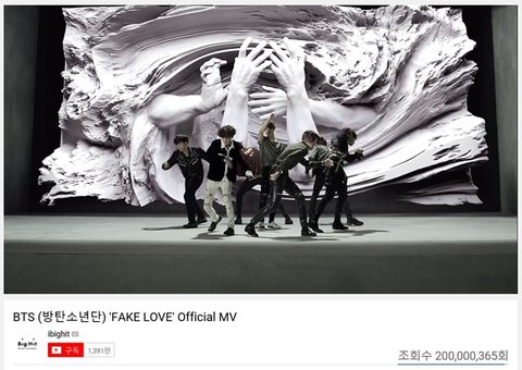 그룹 방탄소년단의 ‘FAKE LOVE’ 뮤직비디오가 2억뷰를 돌파했다.