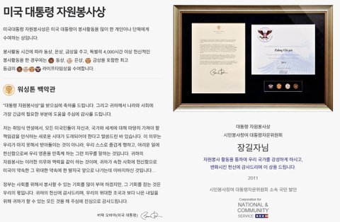 국제위러브유운동본부 장길자회장님의 미국 대통령(오바마)자원봉사상 라이프타임상 수상